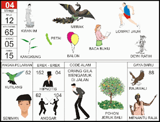 Sementara itu,angka pelarian 04 adalah 52,yang disilbolkan oleh burung gelatik serta profesi seniman.Untuk kombinasi 2D 3D, angka 04 berkaitan dengan hipnotis (152-04) dan pemain anggar (62-104).Adapun kode alam yang menyertainya adalah pohon jeruk bali sebagai pembuka angka 04.