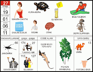 Angka main 27 dalam buku mimpi, baik untuk erek erek maupun kode alam, dilambangkan dengan binatang kura-kura, yang dikenal sebagai simbol ketenangan, kesabaran, serta perlindungan karena tempurungnya yang kuat. Tokoh atau figur yang berada di bawah naungan angka ini adalah wanita cantik, sedangkan benda yang berkaitan dengan angka 27 yaitu sabun bubuk.